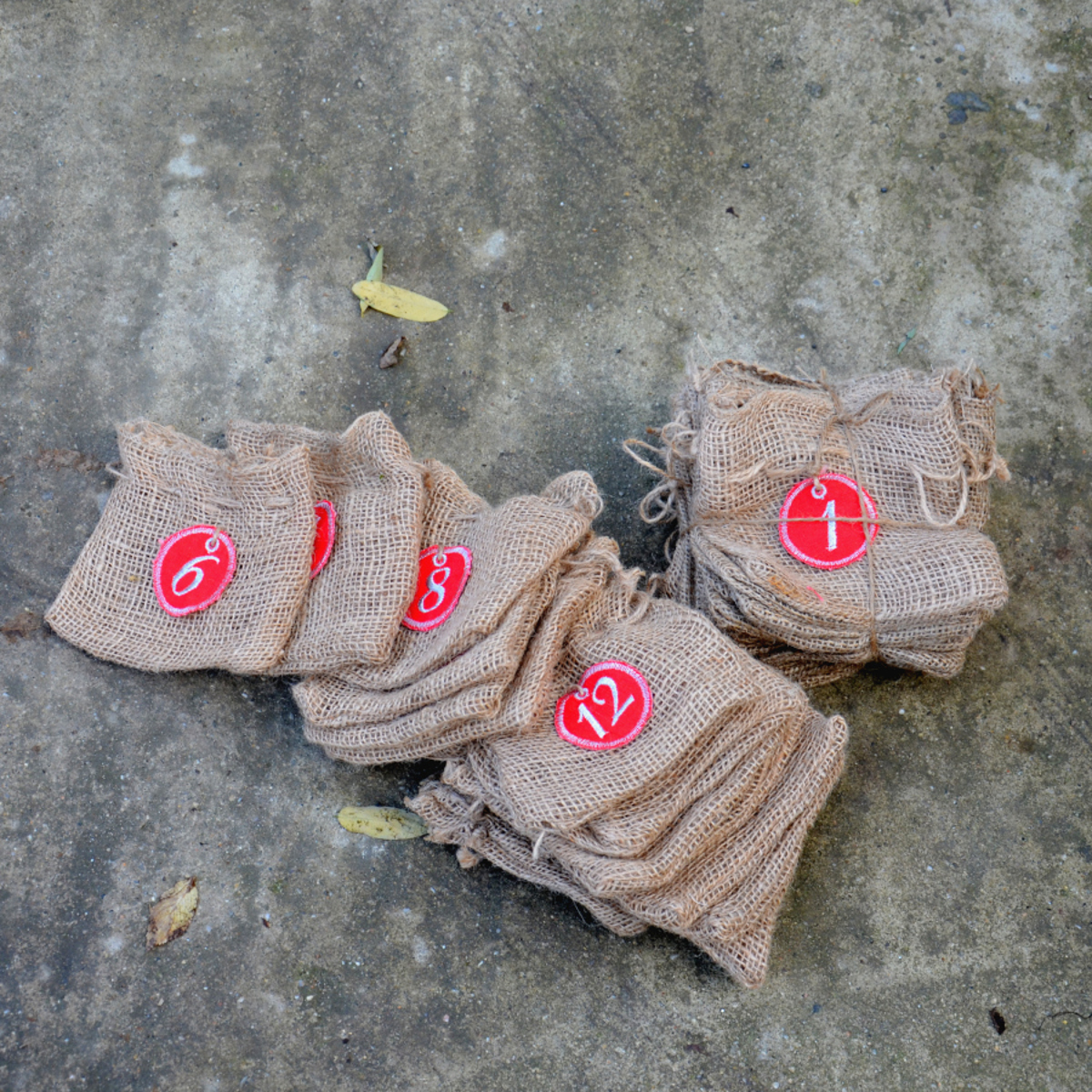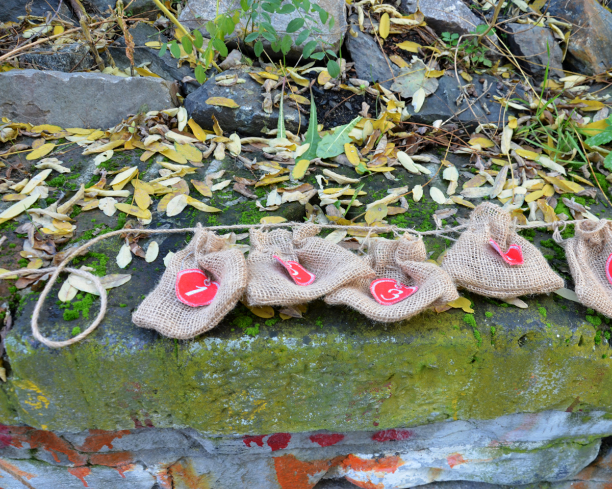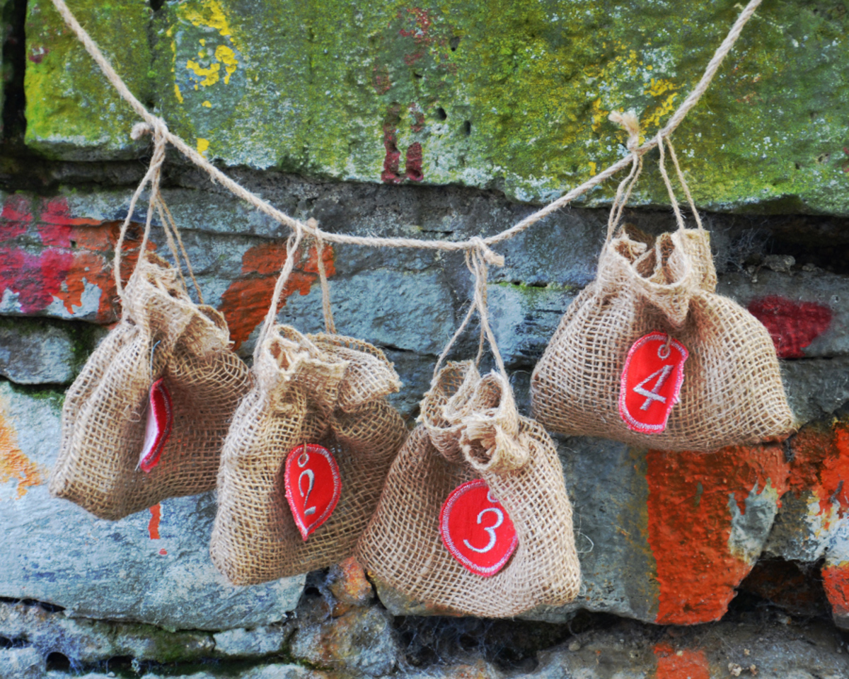 Adventní pytlíkový kalendář. 24 sáčků s výšivkami jednotlivých dnů.