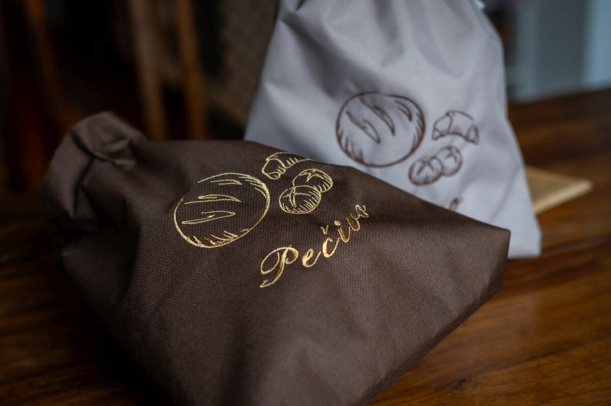 Ozdobeno naší vlastní výšivkou s tématikou pečiva.