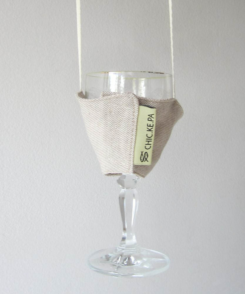 Plátěný obal na sklenku na víno se závěsnou šňůrkou.