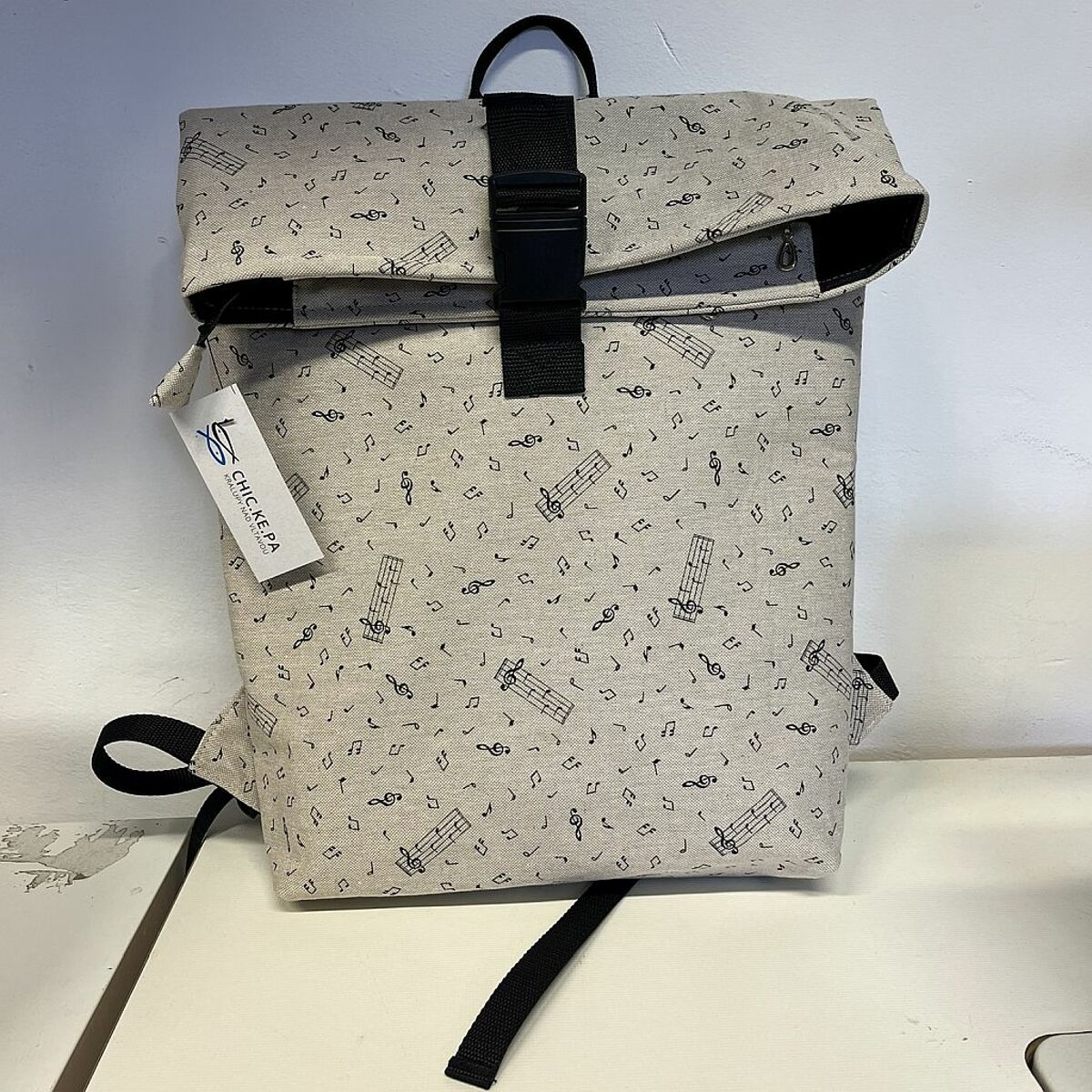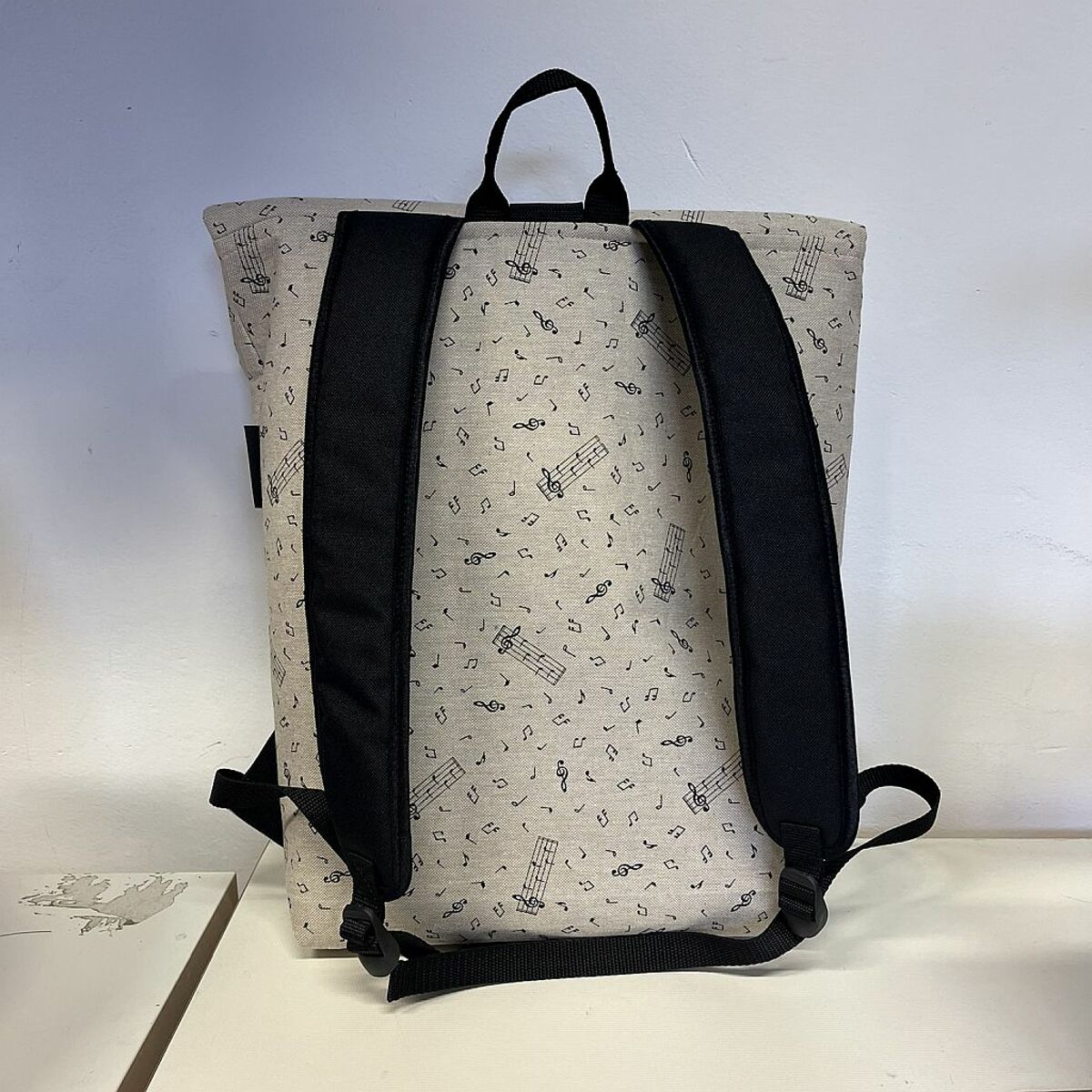 Stylový a praktický městský rolovací batoh z režné látky s jemným motivem not. Batoh je ručně ušitý v šicí dílně Charity Kralupy nad Vltavou, a jeho koupí tak podpoříte smysluplnou práci a lokální výrobu.