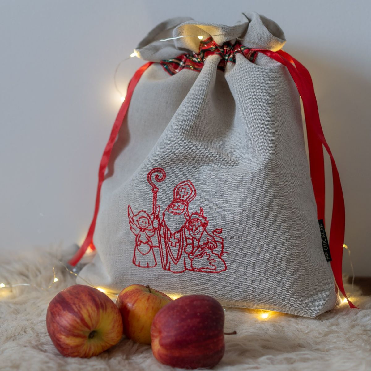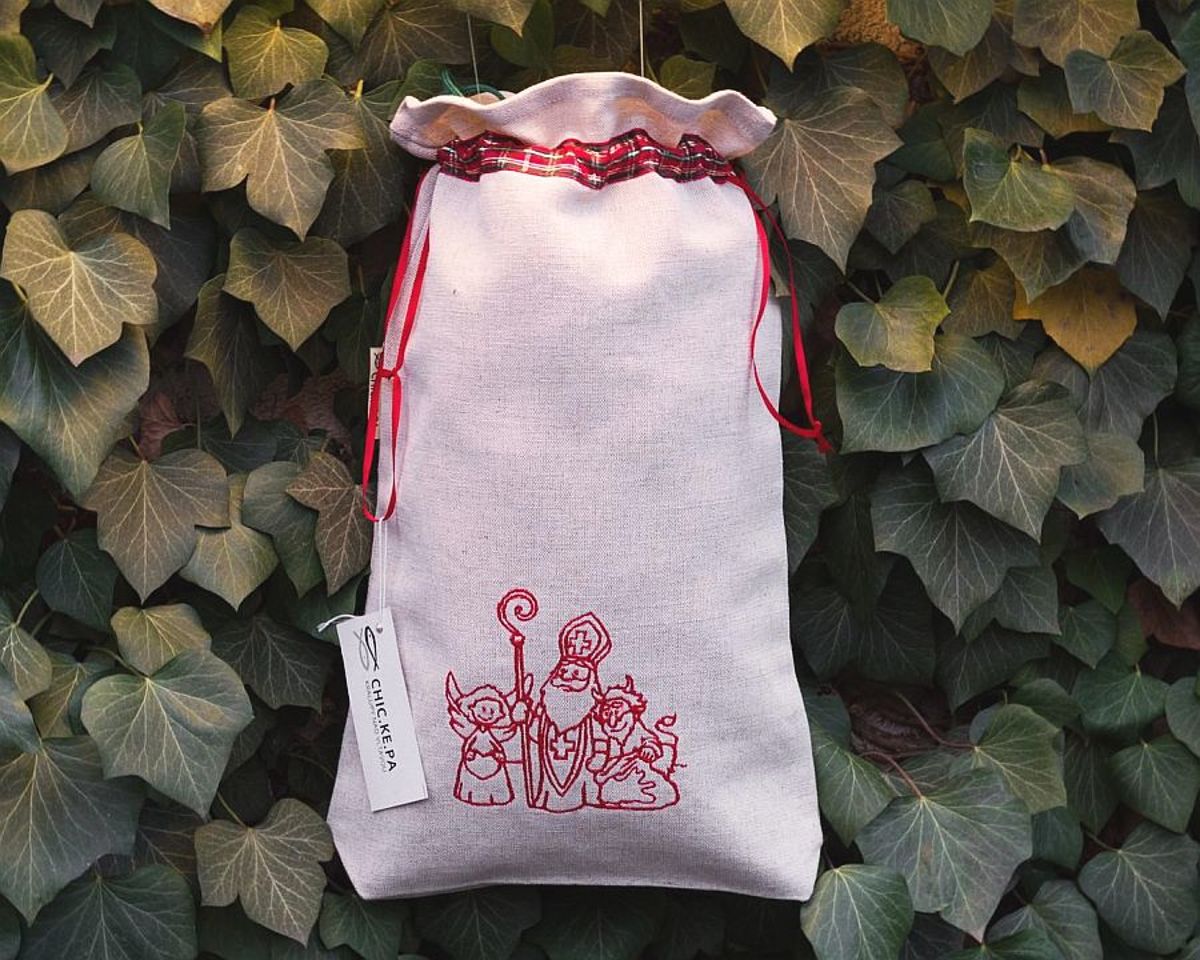 Lněný vak na Mikulášské dobroty s naší vlastní výšivkou v červené barvě.