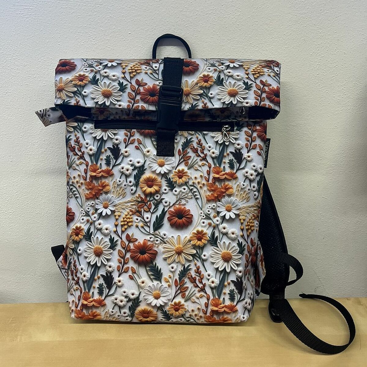 Stylový a praktický střední rolovací batoh z voděodolné látky s motivem květin. Batoh je ručně ušitý v šicí dílně Charity Kralupy nad Vltavou, a jeho koupí tak podpoříte smysluplnou práci a lokální výrobu.